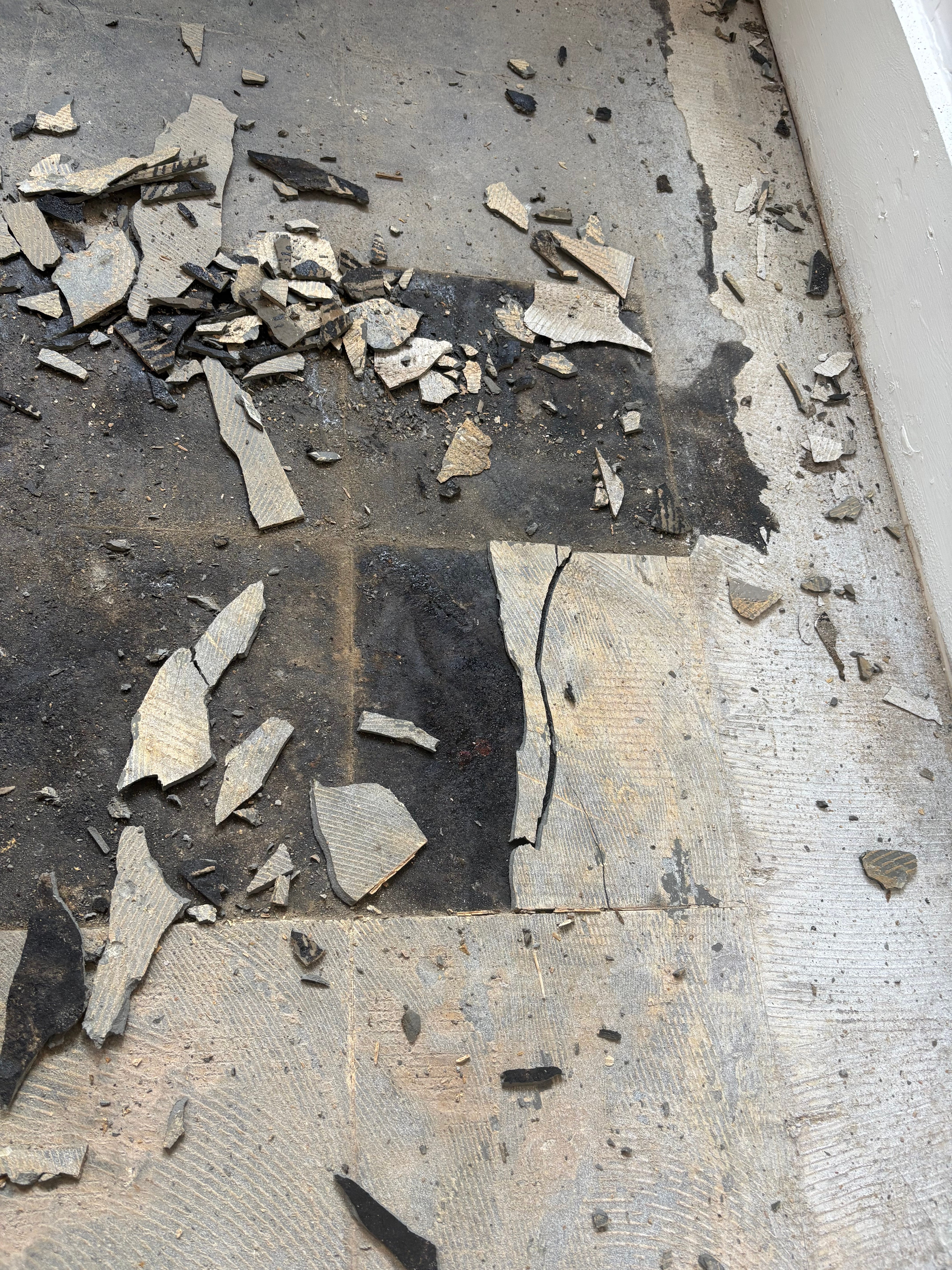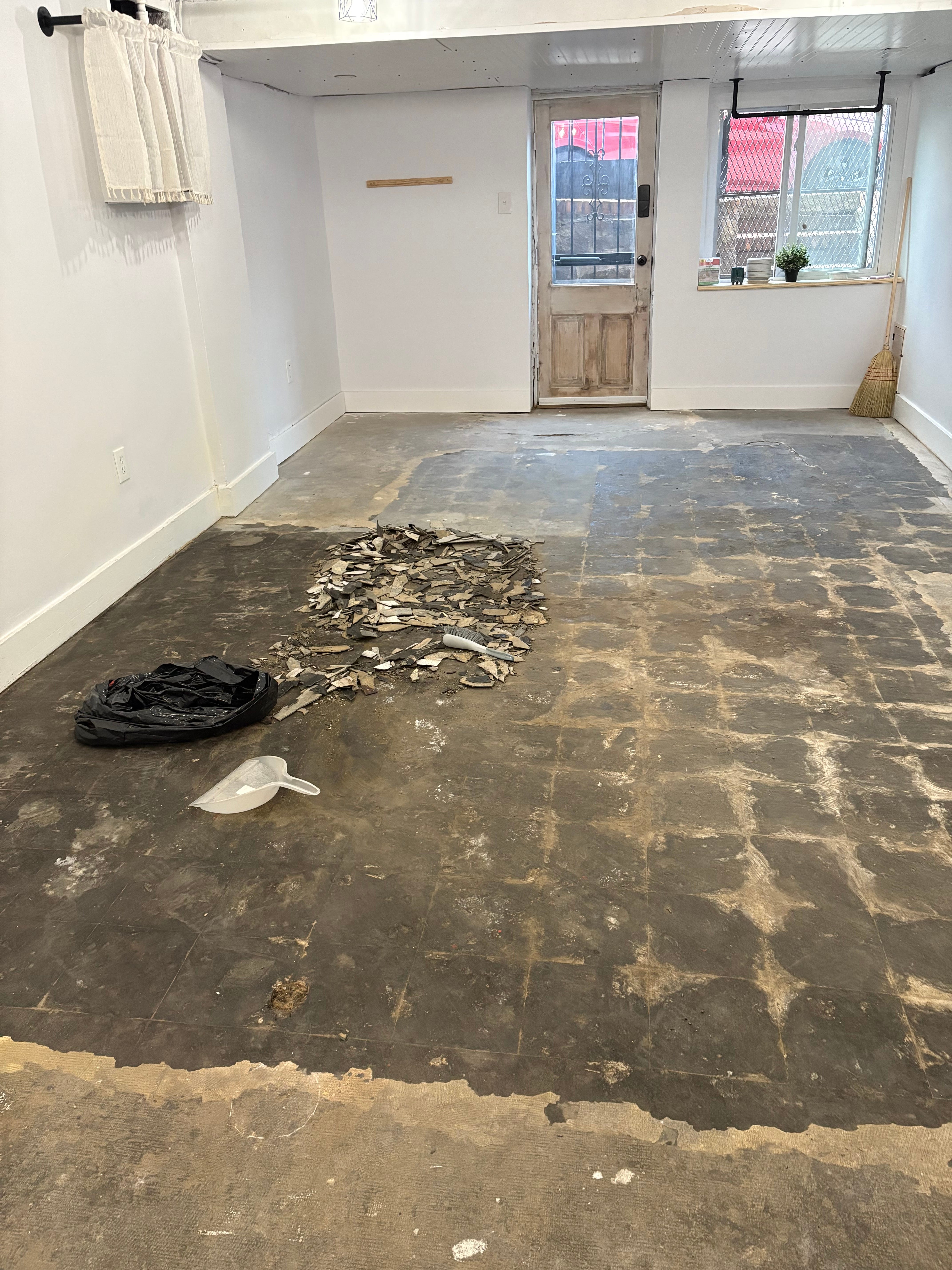 Okay, so now pictures! In a classic case of forgot-to-get-a-before-picture, I don’t have a good picture that shows the tiles the floor was covered in before I took a hammer and scraper to them.